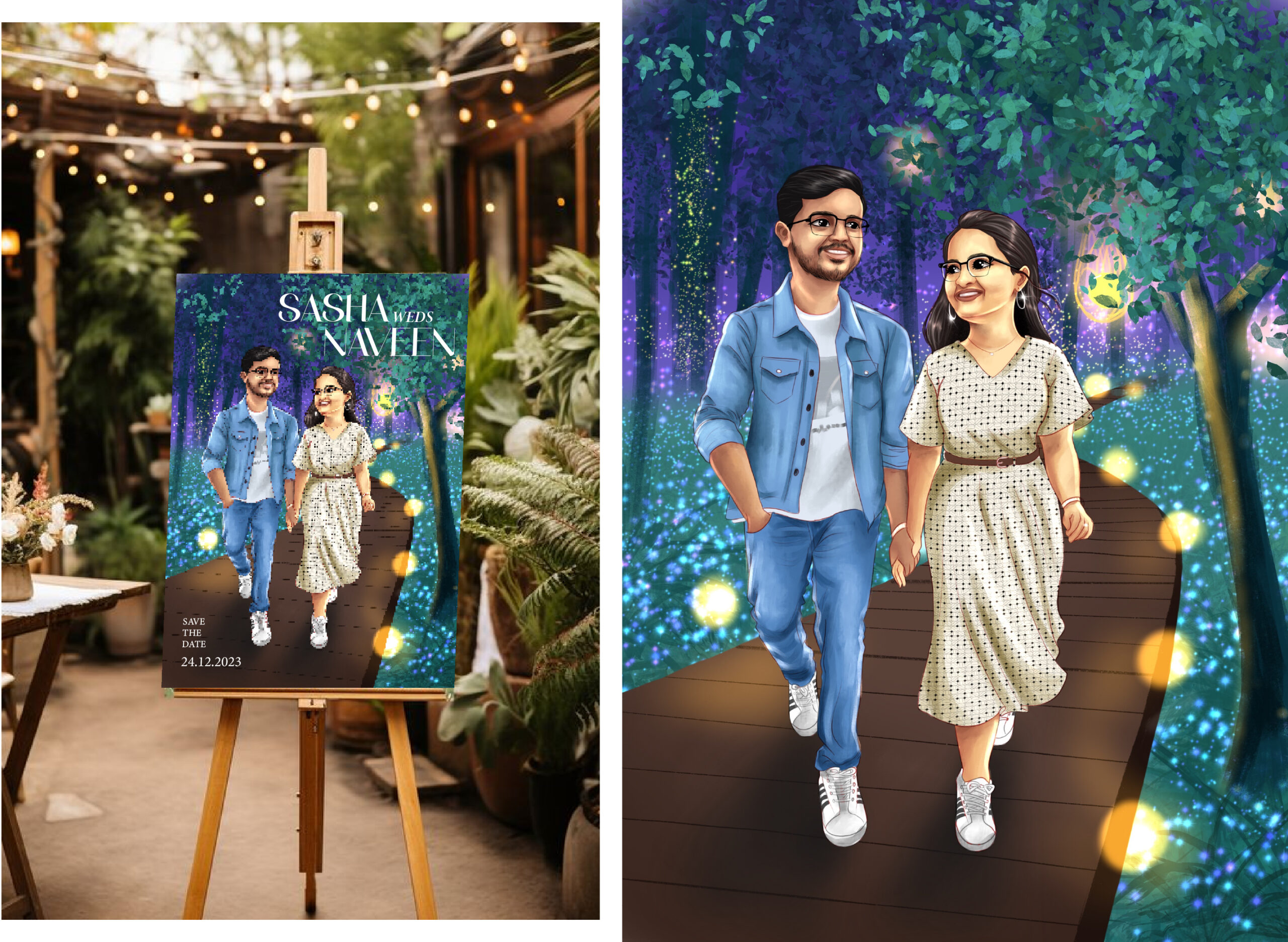Each board is a one-of-a-kind keepsake that sets a personal tone for the celebration. Whether it’s a stylized couple in an “enchanted forest” or a playful life-size cutout, these designs offer a creative, artistic alternative to standard event signage.