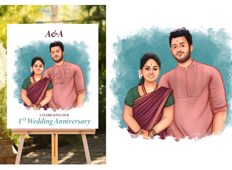 These projects feature hand-drawn digital illustrations designed specifically for event welcome boards. Each piece focuses on a custom portrait that captures the spirit of the occasion, from whimsical wedding scenes and elegant anniversaries to vibrant first birthday celebrations.